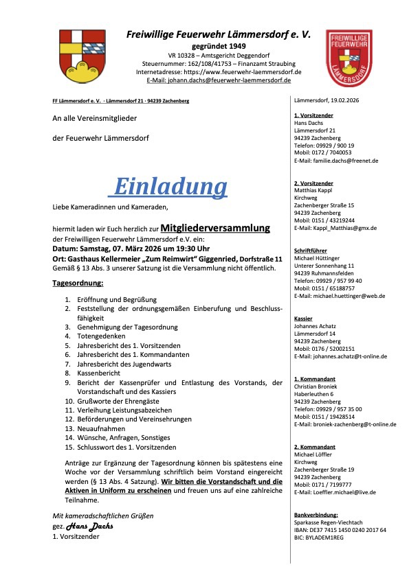 Beitrittserklärung Sie wollen Mitglied bei der FFW Lämmersdorf werden? Dann Dokument downloaden, ausfüllen und bei uns abgeben! Beitrittserklärung 23.pdf PDF-Dokument [232.4 KB]